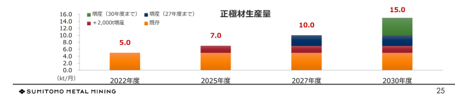 양극재의 1 개월 당 2천톤의 증산은 순조롭게 진행되고 있으며, 다음 증산을 위한 검토가 이뤄지고 있음. 전지 재료 사업의 양극재의 제조는 업계의 동향을 주시해 제조 능력의 키우려는 준비 및 연구 개발을 진행 중