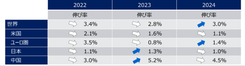 표에서 올해의 경제 성장 예측 등의 수치를 표시하고 있으며, 지정학적 리스크 및 경제권의 블록화 등으로 경기 후퇴가 예상된다. 중국의 회복이 다소 지연되고 있는 점 등 기대했던 만큼의 회복이 이뤄지지 않고 있다.