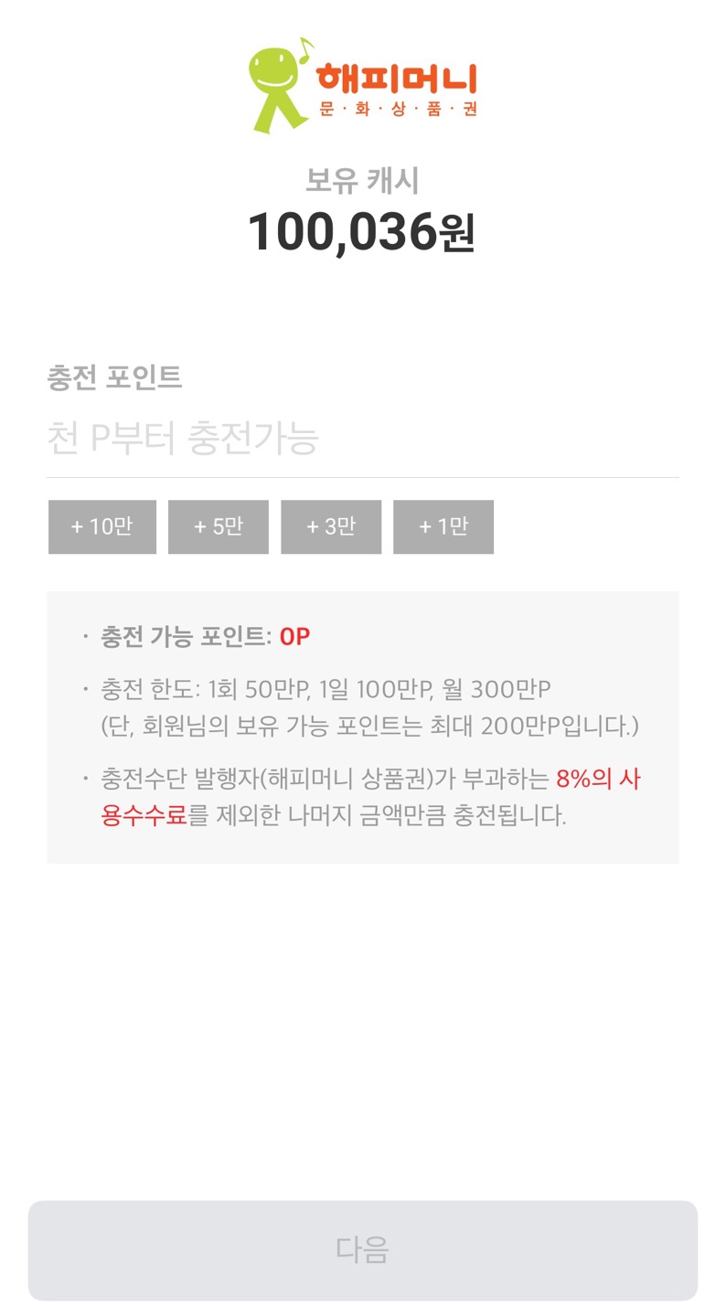 3) 충전 버튼을 선택해서, 해피포인트 캐시를 페이코 포인트로 전환합니다.