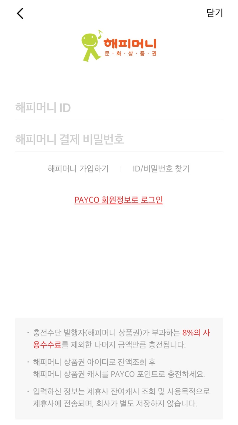 5) 해피머니 계정/패스워드 또는 페이코 회원정보 로그인을 사용해서 해피머니 사이트에 접속합니다.