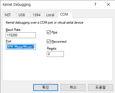 Baud Rate: 115200 입력 / Port: \\.\pipe\com1 / Pipe 체크 / Reconnect 체크