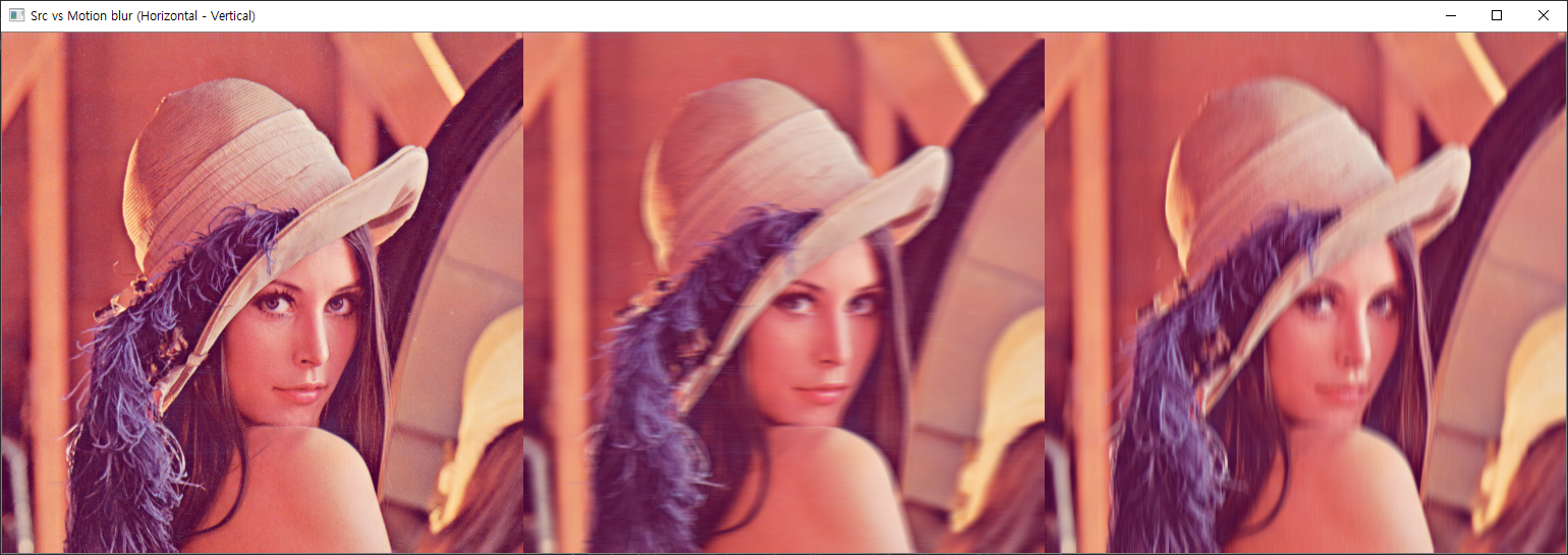 | # mode = 0 horizontal kernel # mode = 1 vertical kernel def motion_blur(image, ksize, mode = 0): kernel_h = np.zeros((ksize, ksize)) kernel_v = np.zeros((ksize, ksize)) kernel_h[int((ksize - 1) / 2), :] = np.ones(ksize) kernel_v[:, int((ksize - 1) / 2)] = np.ones(ksize) kernel_h /= ksize kernel_v /= ksize if mode == 0: return cv2.filter2D(image, -1, kernel_h) else: return cv2.filter2D(image, -1, kernel_v) |